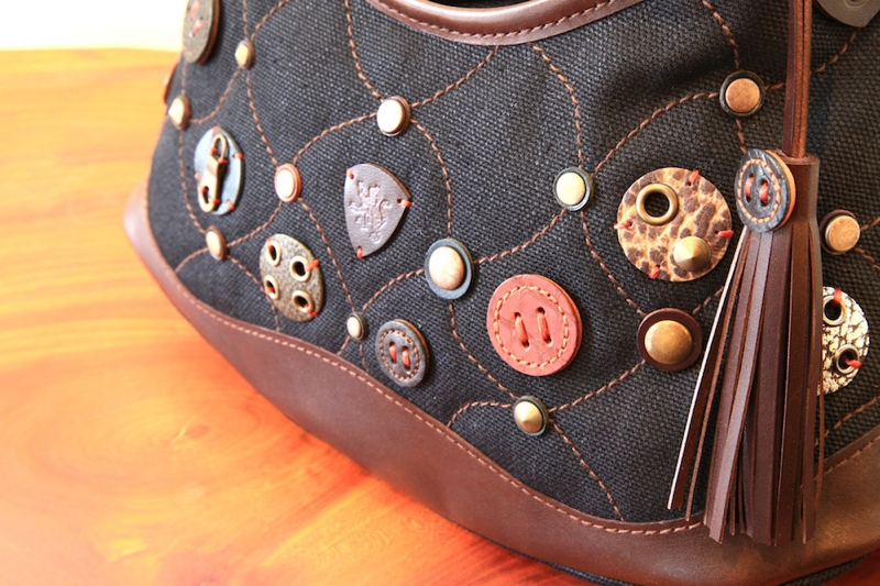 ヘンプとタンニンレザーのショルダーBAG。持ち手は麻糸を使いハンドステッチで仕上げ中パーツの生地にはハンプを使っています。